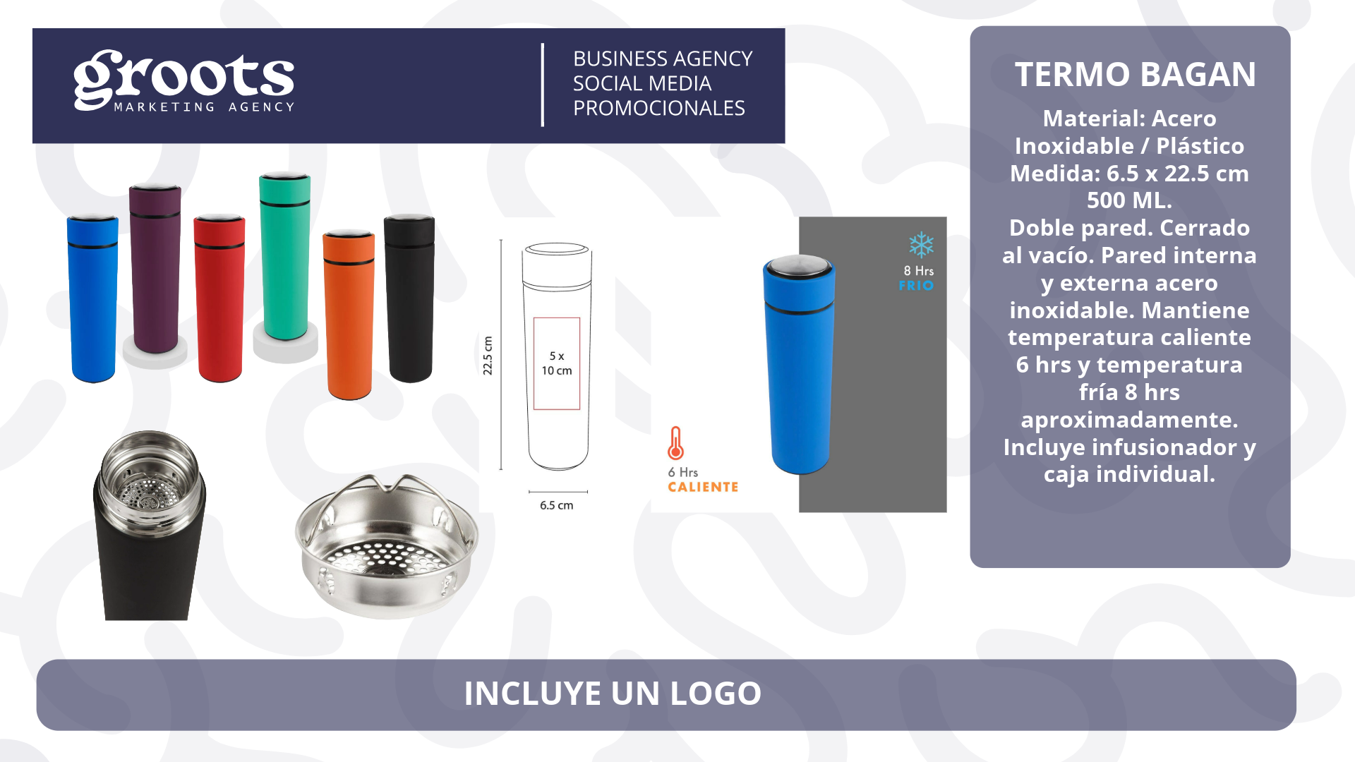 Termo bagan Doble pared. Cerrado al vacío. Pared interna y externa acero inoxidable. Mantiene temperatura caliente 6 hrs y temperatura fría 8 hrs aproximadamente. Incluye infusionador y caja individual.