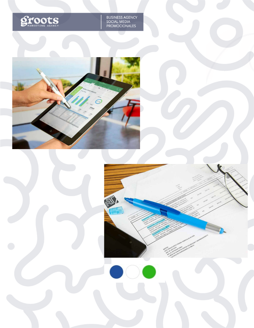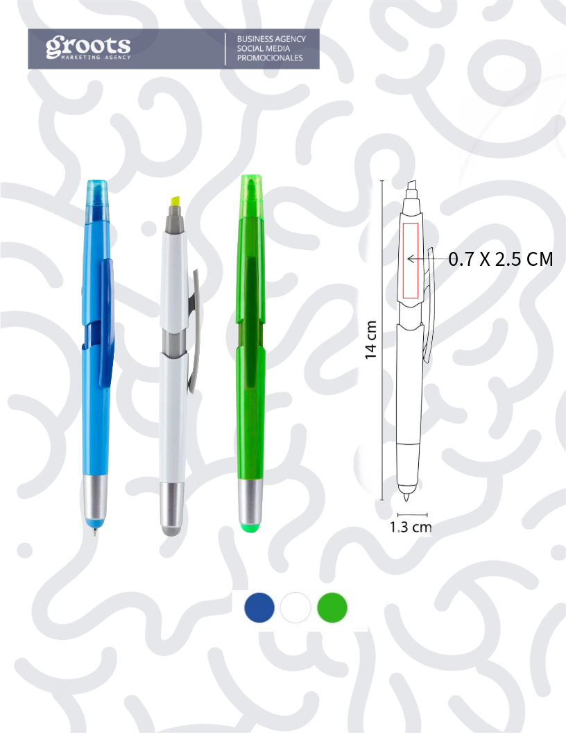 Bolígrafo con touch screen y marca-texto. Mecanismo pulsador. Plástico, 1.3 X 14 cm. incluye grabado de un logo con técnica de impresión en serigrafia.