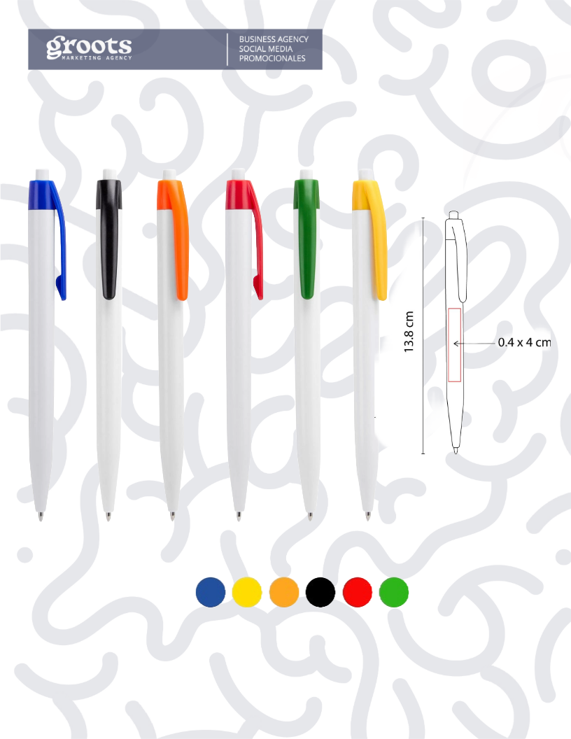 Bolígrafo plástico con mecanismo de pulsador, 0.8 X 13.9 cm, incluye grabado de un logo con técnica de impresión en serigrafia.