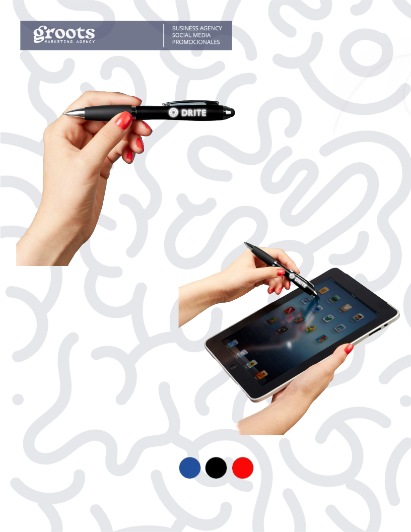 Bolígrafo con luz LED y touch screen. Mecanismo twist. Al grabar y girar, el logotipo se ilumina. Plastico, 1.2 X 14.5 cm, incluye grabado de un logo con técnica de impresión en serigrafia.