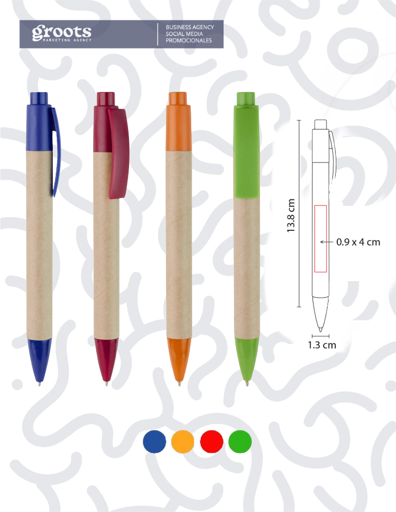 Bolígrafo ecológico, 1.3 X 13.8 cm. tinta negra, incluye grabado de un logo con técnica de impresión en serigrafia.