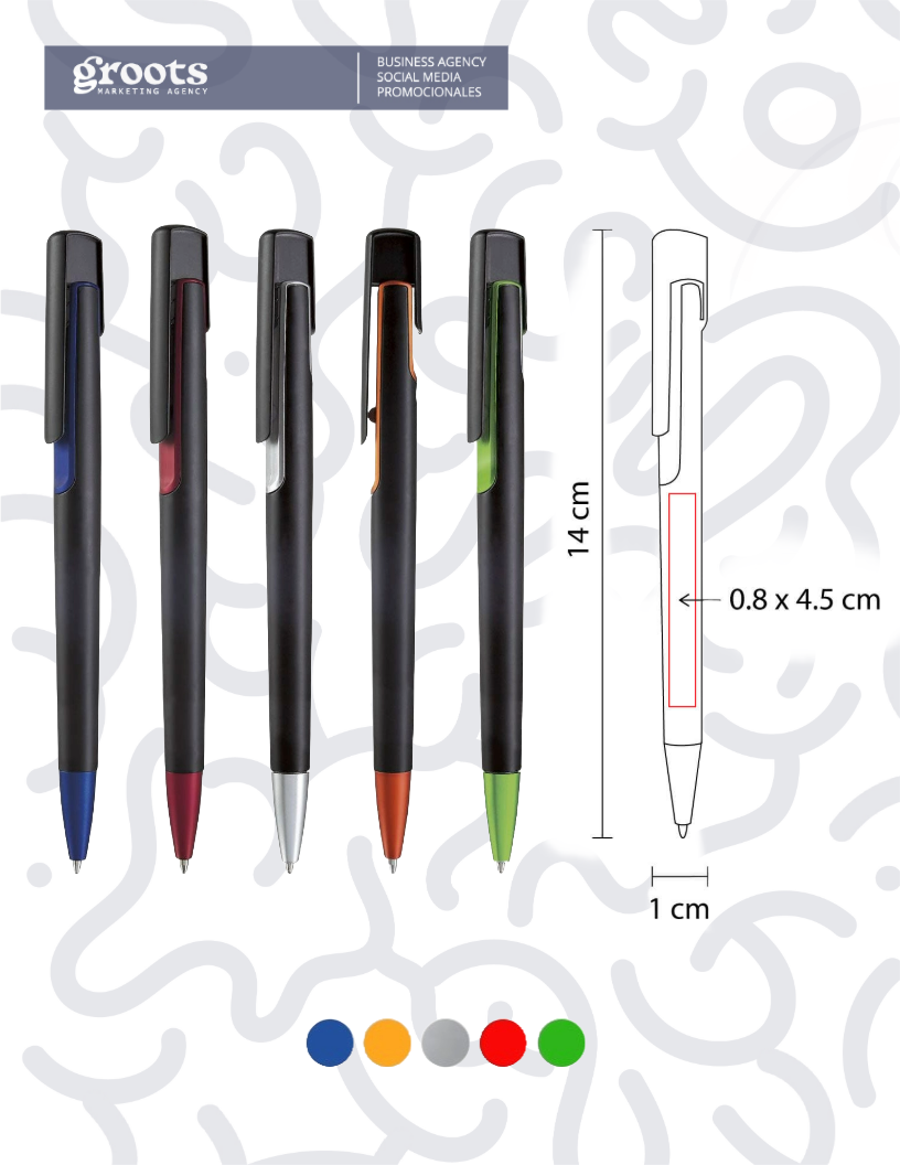 Bolígrafo plástico con pulsador, 1 X 14 cm. incluye grabado de un logo con técnica de impresión en serigrafia.