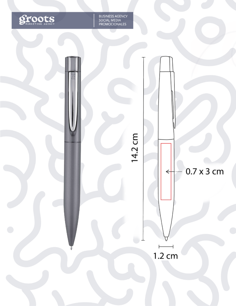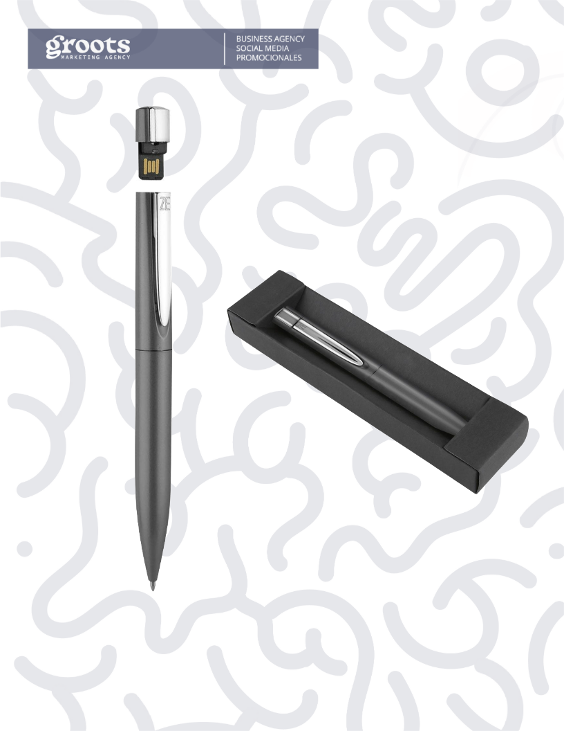 Bolígrafo USB de 8 GB. Mecanismo twist. Incluye estuche. Metal, plástico,1.2 X 14.2 cm. incluye grabado de un logo con técnica de impresión en serigrafia.