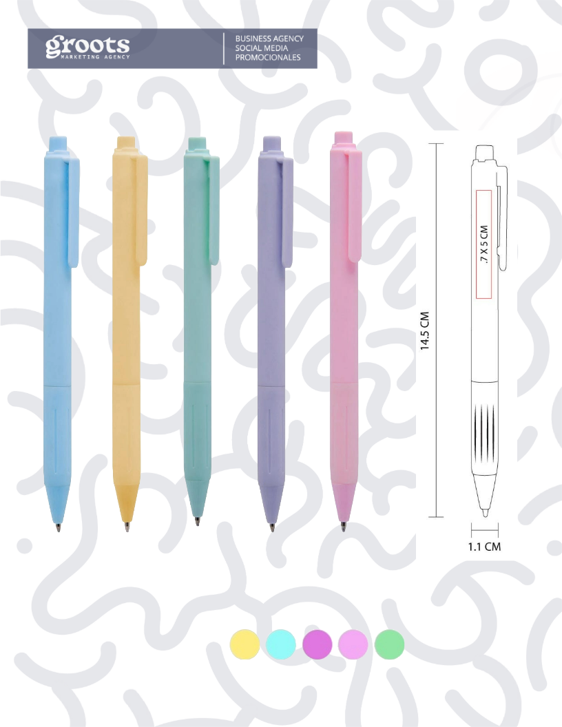 Bolígrafo en colores pastel. Grip de silicón antiderrapante, 1.1 X 14.5 cm, incluye grabado de un logo con técnica de impresión en serigrafia.