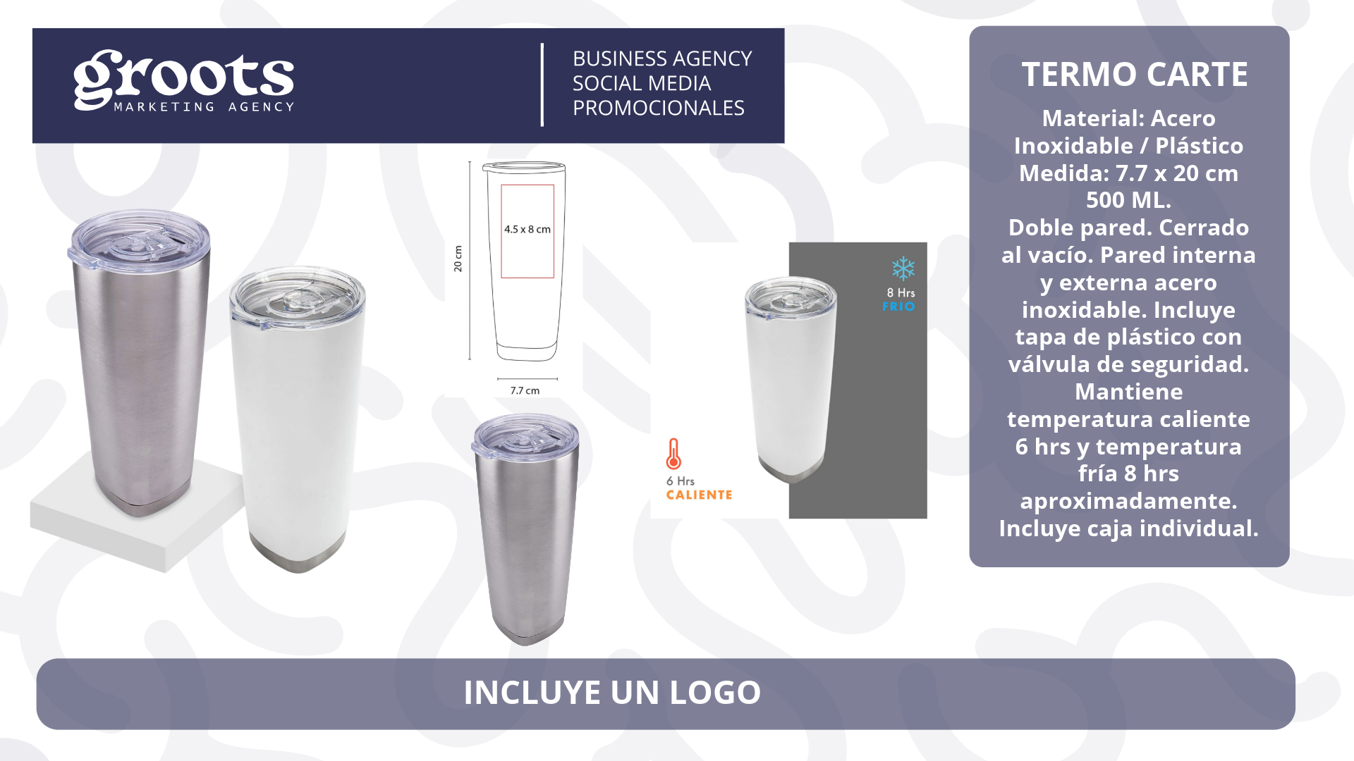 Termo Carte Doble pared. Cerrado al vacío. Pared interna y externa acero inoxidable. Incluye tapa de plástico con válvula de seguridad. Mantiene temperatura caliente 6 hrs y temperatura fría 8 hrs aproximadamente. Incluye caja individual.