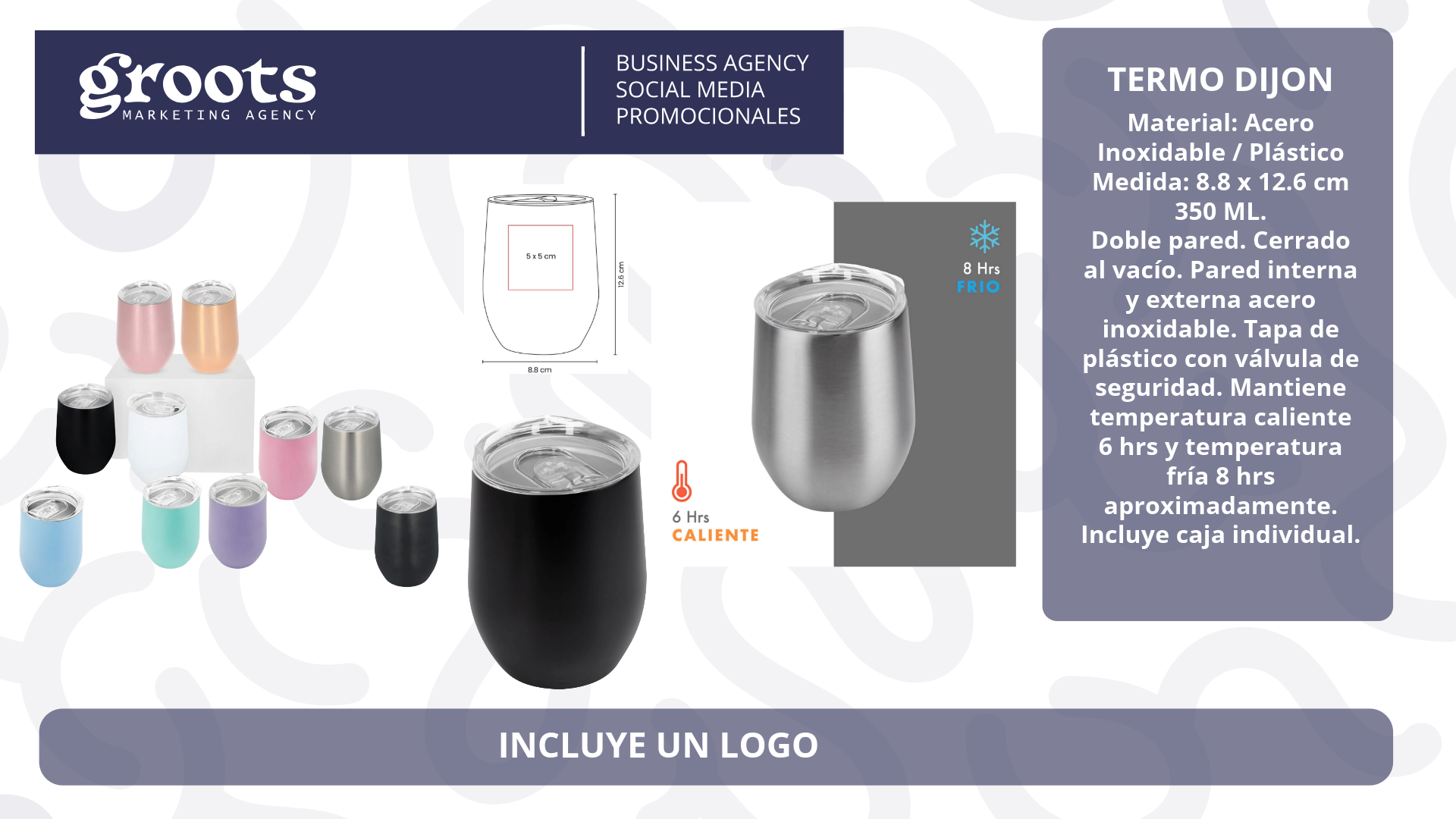Termo Dijon Doble pared. Cerrado al vacío. Pared interna y externa acero inoxidable. Tapa de plástico con válvula de seguridad. Mantiene temperatura caliente 6 hrs y temperatura fría 8 hrs aproximadamente. Incluye caja individual.