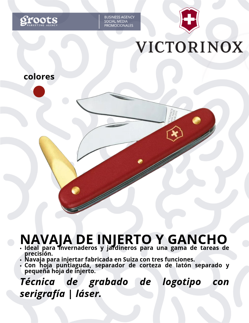 Ideal para invernaderos y jardineros para una gama de tareas de precisión, navaja para injertar fabricada en Suiza con tres funciones, con hoja puntiaguda, separador de corteza de latón separado y pequeña hoja de injerto, incluye grabado de un logotipo con técnica en serigrafia o laser.