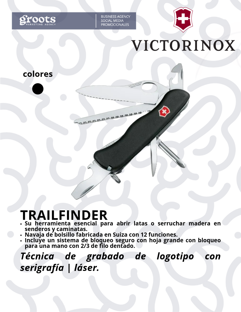 Navaja suiza 12 funciones, sistema de bloqueo seguro, destornillador Phillips incluye 1 grabado de logotipo con técnica en serigrafia o laser.