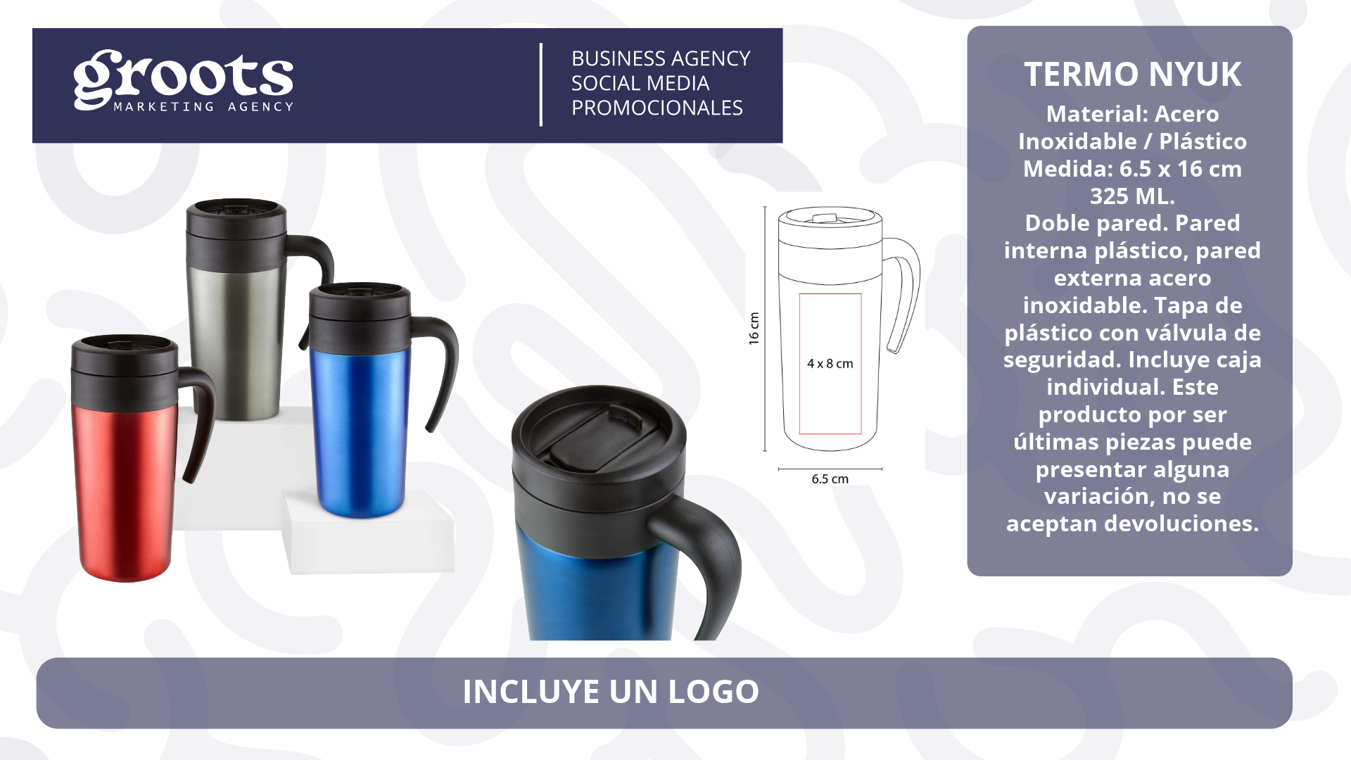 Termo Nyuk Doble pared. Pared interna plástico, pared externa acero inoxidable. Tapa de plástico con válvula de seguridad. Incluye caja individual.