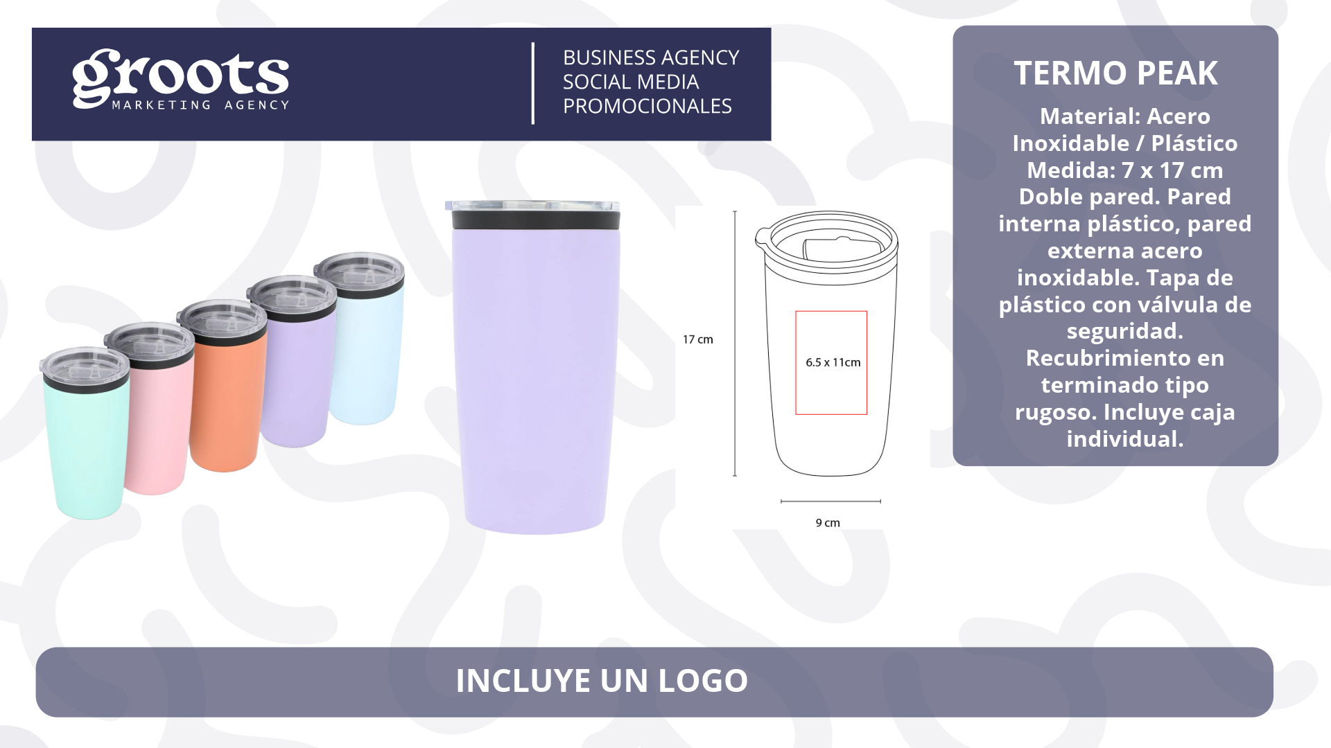 Termo Peak Doble pared. Pared interna plástico, pared externa acero inoxidable. Tapa de plástico con válvula de seguridad. Recubrimiento en terminado tipo rugoso. Incluye caja individual.
