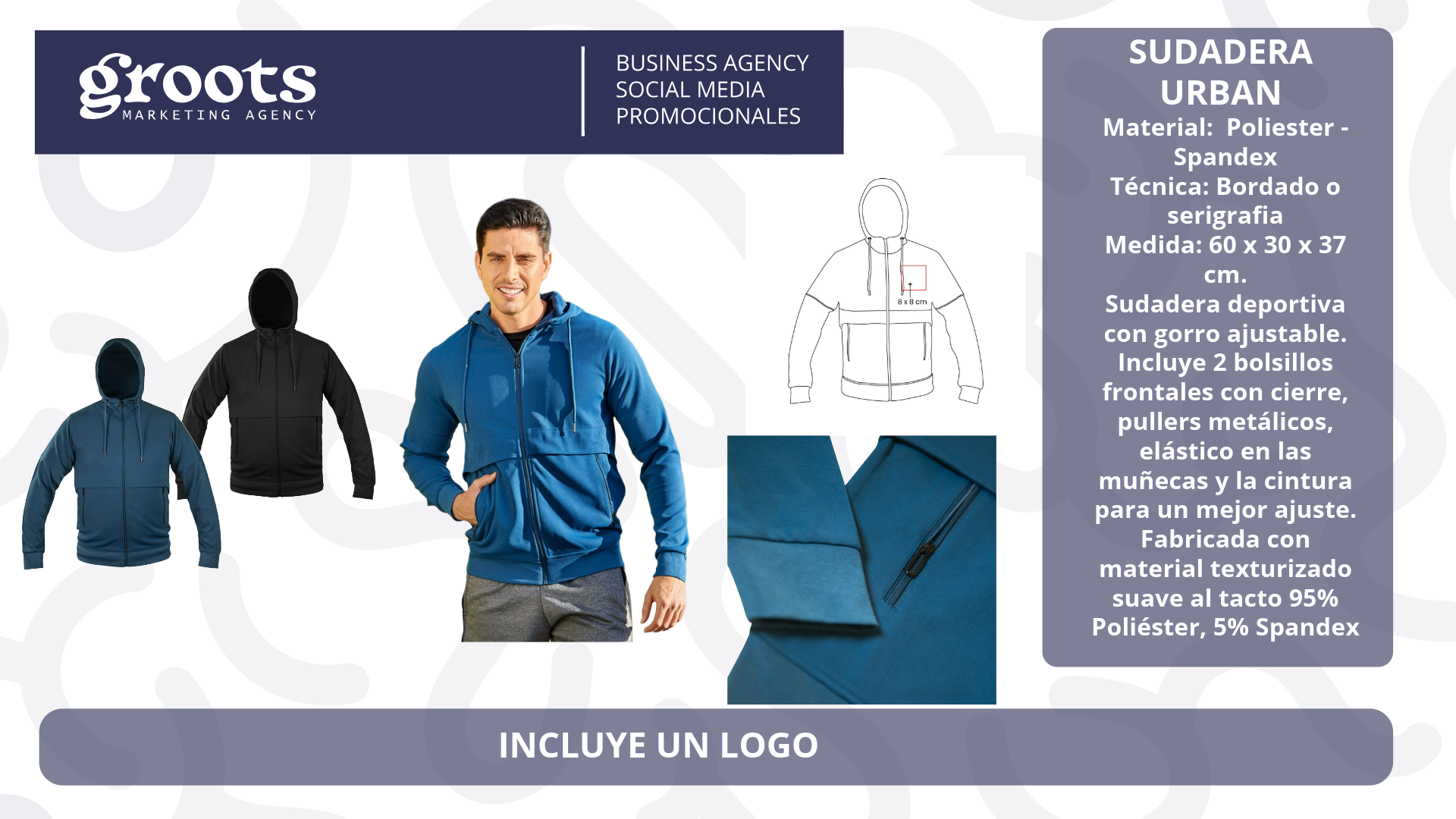 Sudadera deportiva con gorro ajustable. Incluye 2 bolsillos frontales con cierre, pullers metálicos, elástico en las muñecas y la cintura para un mejor ajuste. Fabricada con material texturizado suave al tacto 95% Poliéster, 5% Spandex incluye un logo bordado o en serigrafia según la elección.